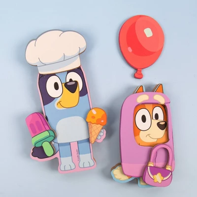 - Bring your favorite on-screen characters off-screen as you mix & match 12 different magnetic outfits and accessories on wooden Bluey & Bingo dolls!