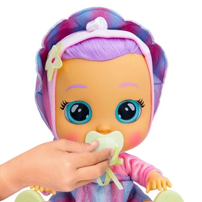 - She cries real tears when you remove her pacifier! Put her paci back in her mouth or lay her down to get her to stop crying!