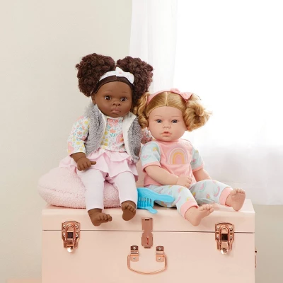 - Adorable realistic 18” toddler doll with light skin, blue eyes, and dark blonde hair.