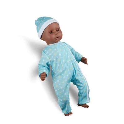- Two 15-inch clothed boy and girl baby dolls with dark skin tone that can suck their thumbs or pacifiers