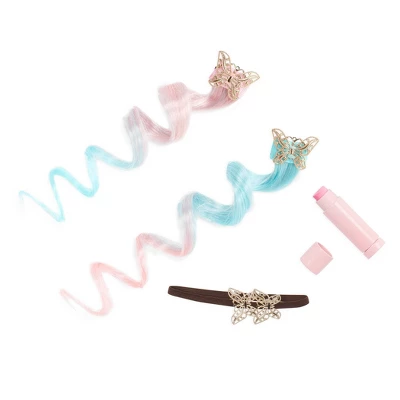 - Includes: doll, dress, a pair of undies, shoes, sponge applicator, butterfly headband, 2 rainbow hair extensions, and a styling guide.