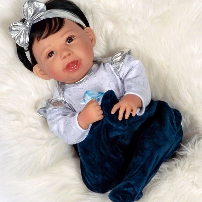 With her brown eyes standing out against her rooted black hair and rosy plump cheeks, Galaxia will capture many hearts. She is perfectly suited up in a jersey knit constellation bodice with metallic silver fabric accents, a navy-blue velour footed sleeper, and a silver bow headband that matches her playful look. She also comes with a planet plush to cuddle at night. Take off her magnetic pacifier and surprise yourself with a cheerful smile and two bottom baby teeth!Galaxia is lovingly sculpted by world-renowned doll artist Jannie de Lange. This lifelike toddler girl doll measures 21 inches from head to toe. Crafted from our premium GentleTouch Vinyl with a weighted cloth body for that wonderfully lifelike feel. Arriving to you in a Collectors Box along with a numbered Certificate of Authenticity with the artists signature. Intended for reborn doll collectors aged 3+.