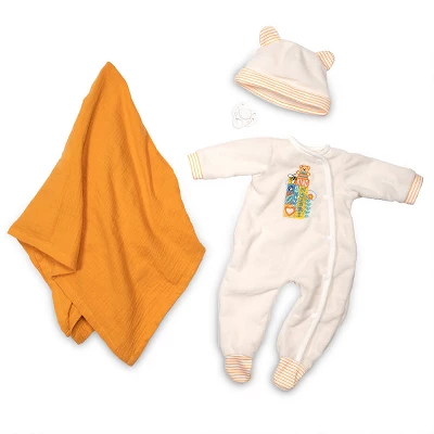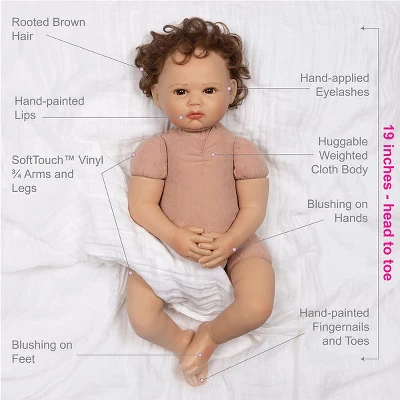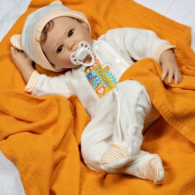 Spring into nature fun with Nature Lover! Dressed in a luxuriously soft cream footed sleeper with an embroidered message that says, Be Kind 2 Nature and a matching, striped cap with bear ears, a day of outdoor exploration with this gender- the neutral baby doll will surely leave you refreshed and inspired. Nature Lover has soft, wispy brown curls poking out its baby cap. This little darlings hair perfectly frames its charming brown eyes, rosy plump cheeks, and baby lips. Look at those cute folds on its baby chin… so tempting to kiss! This baby also comes with a white magnetic pacifier and a mango-colored muslin swaddling blanket for the best sleep ever. Nature Lover is a 19-inch realistic gender-neutral baby doll sculpted with love by world-renowned artist Michelle Fagan. This lifelike oddler is crafted from our premium SoftTouch Vinyl which gives it a delicious baby powder scent and a realistic feel. With this vinyl, Nature Lover has incredibly realistic features including baby creases and rolls! Arriving to you in our new eco-friendly Collectors ox and a numbered Certificate of Authenticity with the artists signature. Intended for reborn doll collectors aged 3+. Browse our collection of reborn doll accessories, including our popular Reborn Doll Diapers and customer-favorite Baby Doll Magic Bottles! Our doll accessories are perfect for bonding with your baby doll or completing your Paradise Galleries gift.