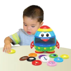 Kids will have a blast learning about space with the Learn With Me Rocket! This cute little rocket will guide kids through learning about things found in space with two different play modes – Discovery and Find It! In Discovery mode, kids will drop the colored portholes fearturing a space item in the Rocket and Rocket will identify it. In Find It! mode, Rocket will ask kids to find an object and place it in Rocket. Rocket will let them know if they found the right object! A cheery voice and funny phrases will keep your kiddos entertained for hours while they learn. All colorful porthole pieces store neatly inside the toy. Requires two “AA” batteries (included). Recommended for ages 2-5 years.