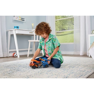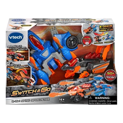 Transform playtime adventures with the Switch & Go® 2-in-1 Spino Speedster! Easily combine the fiery-eyed, light-up Spinosaurus with the Pterodactyl into a fireball-launching mega car. Fuel-injected trouble is on the way! Launch two fireballs from the back of the mega car. Sneak attack! Now switch things up and press the power boost button to launch the Spinosaurus and instantly transform the speedster mega car into two dinos. There’s no stopping this spiny stomper! Check out its fiery light-up eyes. Then pick up the Pterodactyl to take imagination on the fly. Roar, soar and launch! Intended for ages 4+ years. Requires 1 AAA battery. Battery included for demo purposes only. New battery recommended for regular use.